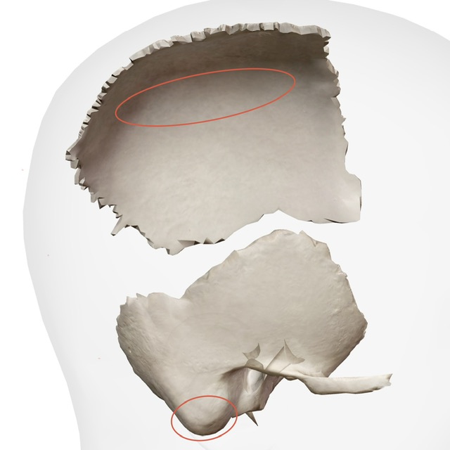 上側の骨は、左の頭頂部の内側です、さらにその内側が脳です。